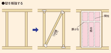 筋交いや面材を入れて補強する、あるいは補強金物を使う工事は、いずれも壁を剥いで行います。必然的に内装工事を伴いますから、大がかりなリフォームの時に一緒に行うと費用的にも無駄が出ません。