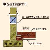 建物を支える基礎は、鉄筋入りのコンクリート造布基礎が理想です。布基礎は平らに連続した基礎のこと。 基礎に鉄筋が入っていない場合は、既存の基礎に後付けして基礎の強さを増すことができます。 当社にてご相談ください。